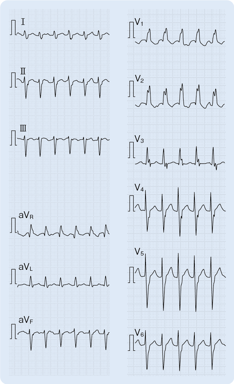 - 特記すべき既往歴のない男性。受診当日の朝から発熱,嘔吐,水様下痢が出現したため前医を救急受診し,急性胃腸炎の診断で入院となった。夜間に突然の動悸と気分不良が出現したため12誘導心電図を実施したところ,心拍数145回/分の頻拍を認め,血圧低下も伴っていた。除細動を施行するも頻拍が再発するため,ベラパミル5mgを点滴静注したところ停止した。頻拍に対する精査加療目的で当院に転院となった。前医での頻拍時12誘導心電図を図1に示す。なお,下記の身体所見および検査所見も前医にて施行したものである。