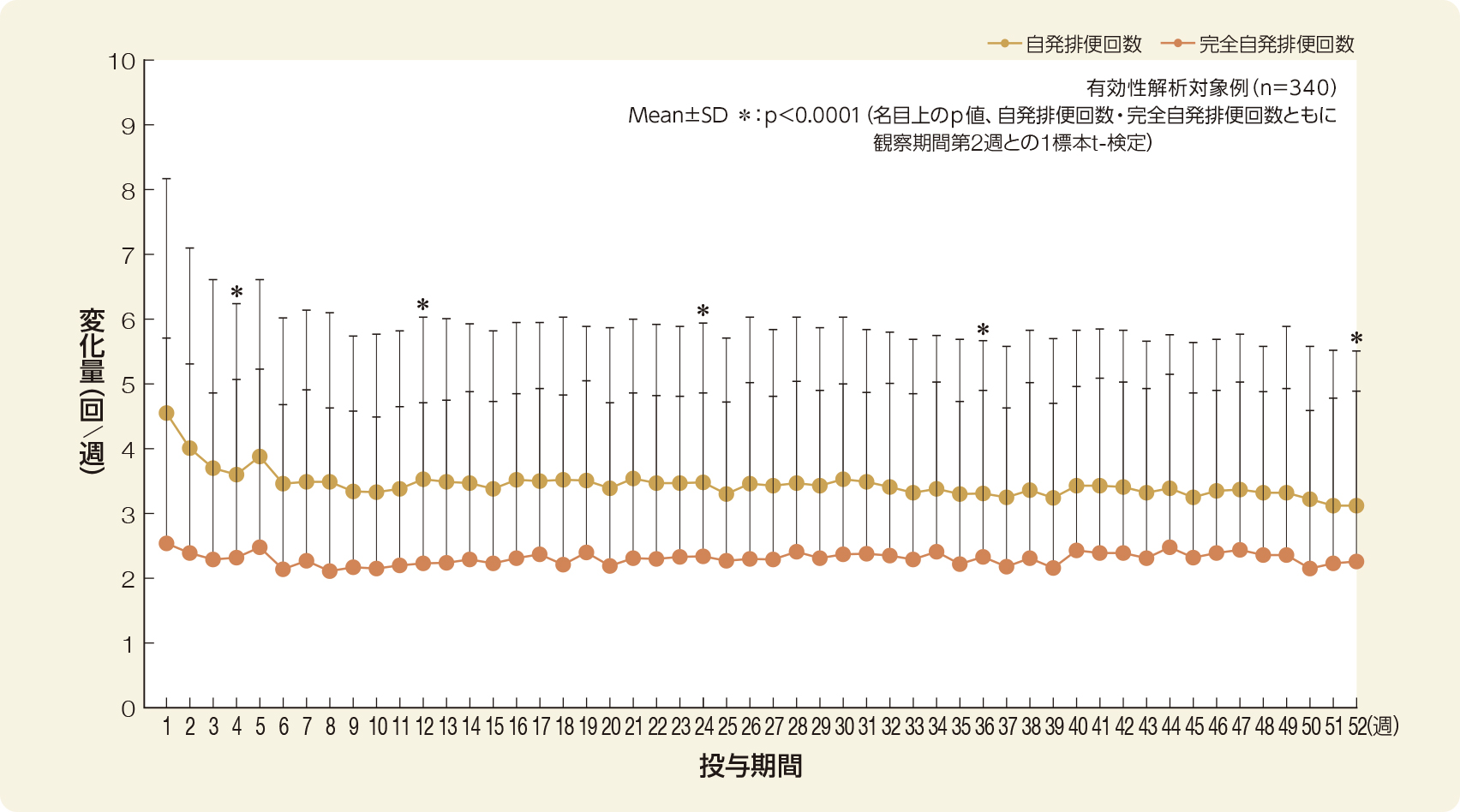 自発排便回数、完全自発排便回数について、観察期間第2週と投与期間第4週、第12週、第24週、第36週及び第52週の時点における変化量について比較検定を行った。いずれの時点においても観察期間第2週と比較して有意な増加が認められた(いずれもp<0.0001、名目上のp値、1標本t-検定)。