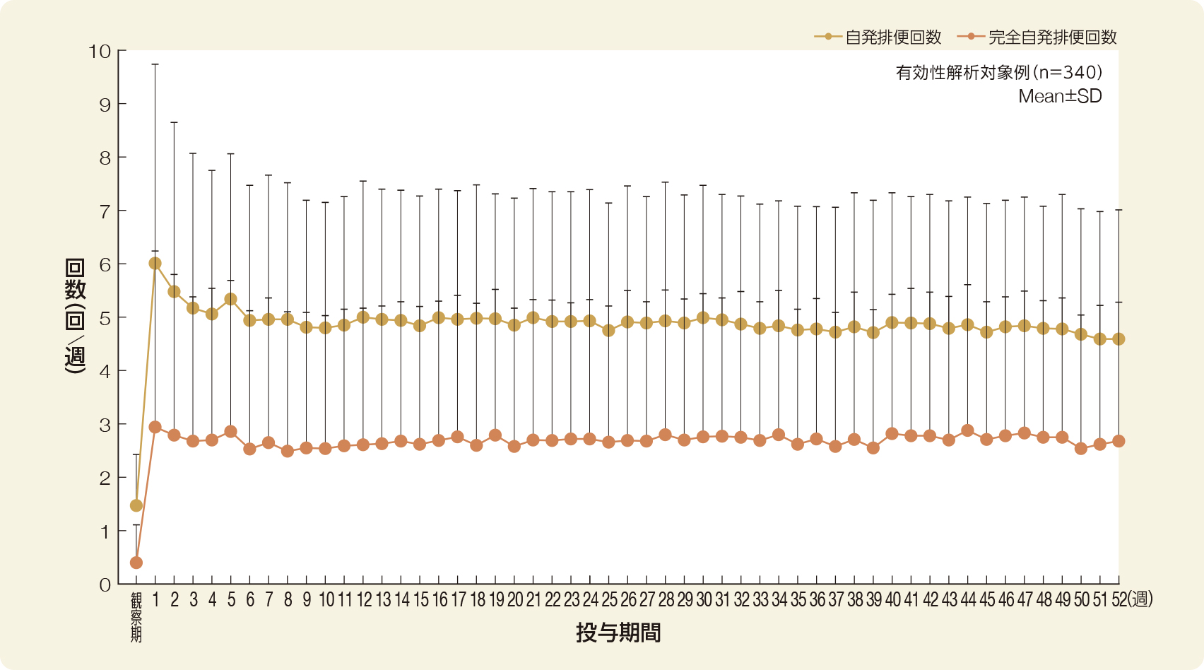 週あたりの自発排便回数及び完全自発排便回数は、投与期間第1週から増加し52週時点まで下記の通り推移した。