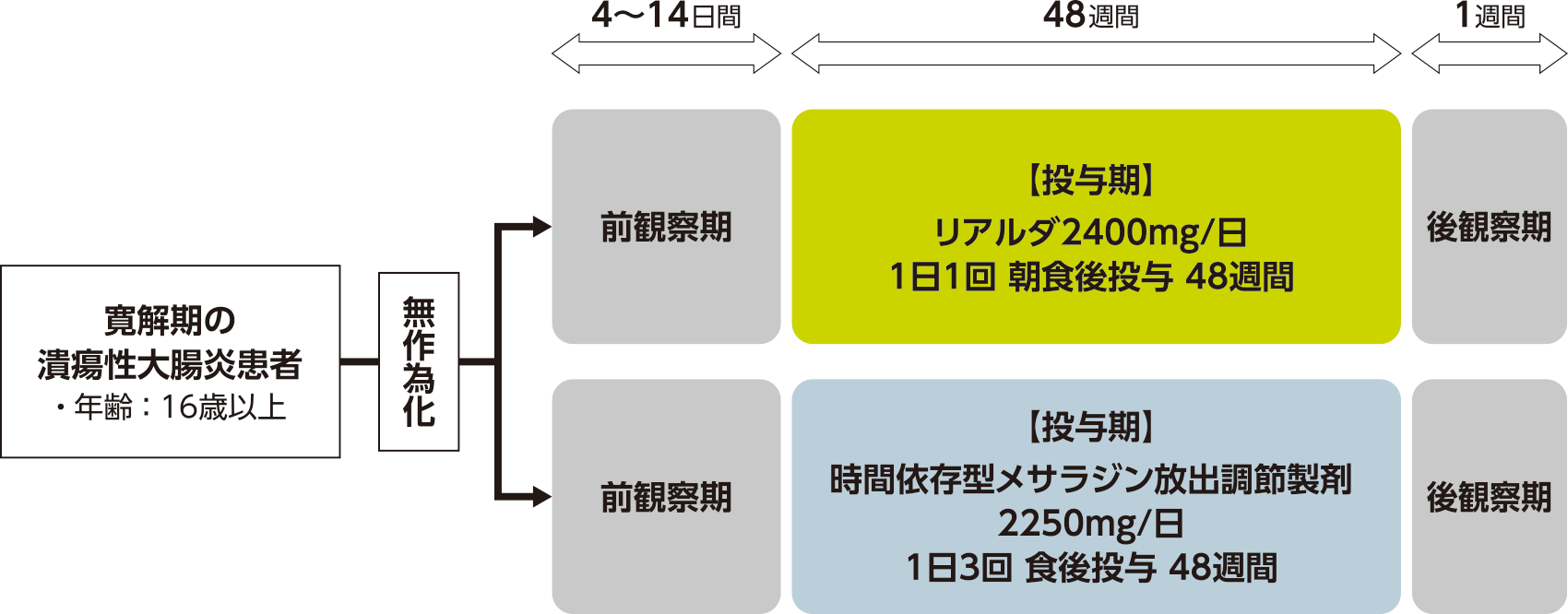 対象患者をランダムにリアルダ2400mg/日(1日1回)群、時間依存型メサラジン放出調節製剤2250mg/日(1日3回)群の2群に割り付けた。試験期間は、前観察期(4~14日間)、投与期(48週間)、後観察期(1週間)から構成された。