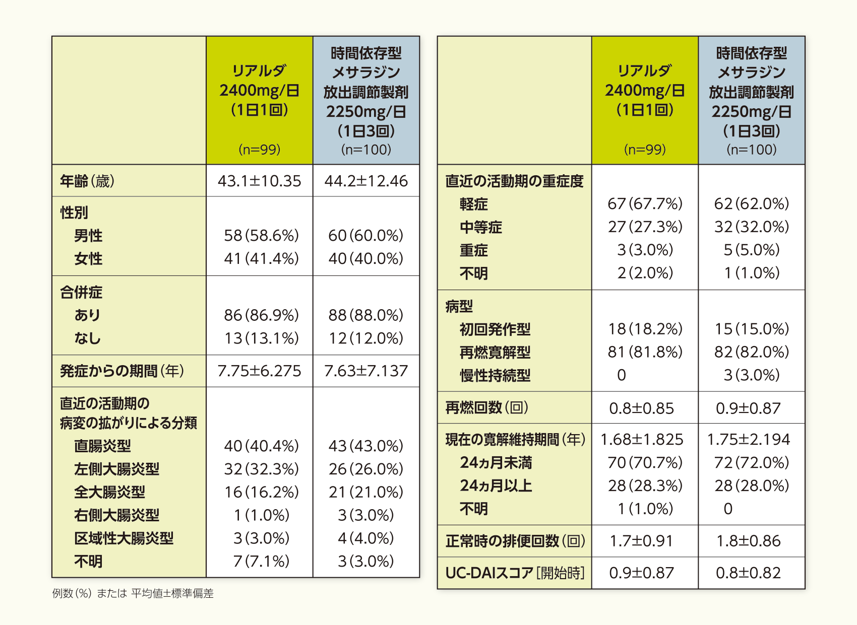寛解期の潰瘍性大腸炎患者を対象に、時間依存型メサラジン放出調節製剤2250mg/日(1日3回)に対するリアルダ2400mg/日(1日1回)の「非劣性」を検証することを目的とした。