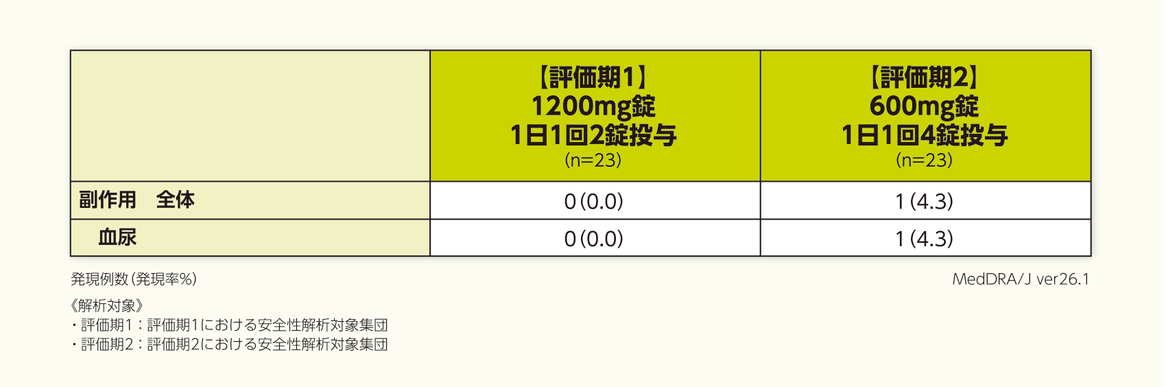 なお、副作用の発現率は、評価期1では0%(0/23例)、評価期2では4.3%(1/23例:血尿1例)であった。