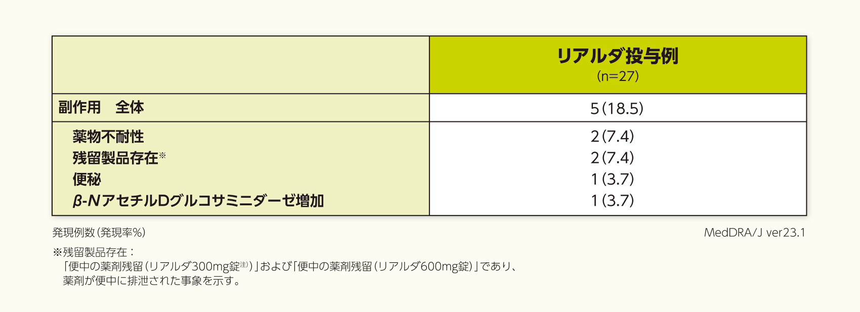 投与期の有害事象の発現率は66.7%(18/27例)であり、認められた主なもの(発現率10%以上)は上咽頭炎、潰瘍性大腸炎、便秘が各11.1%(3/27例)であった。投与期の副作用の発現率は18.5%(5/27例)であり、認められたものは薬物不耐性、残留製品存在※が各7.4%(2/27例)、便秘、β-NアセチルDグルコサミニダーゼ増加が各3.7%(1/27例)であった。