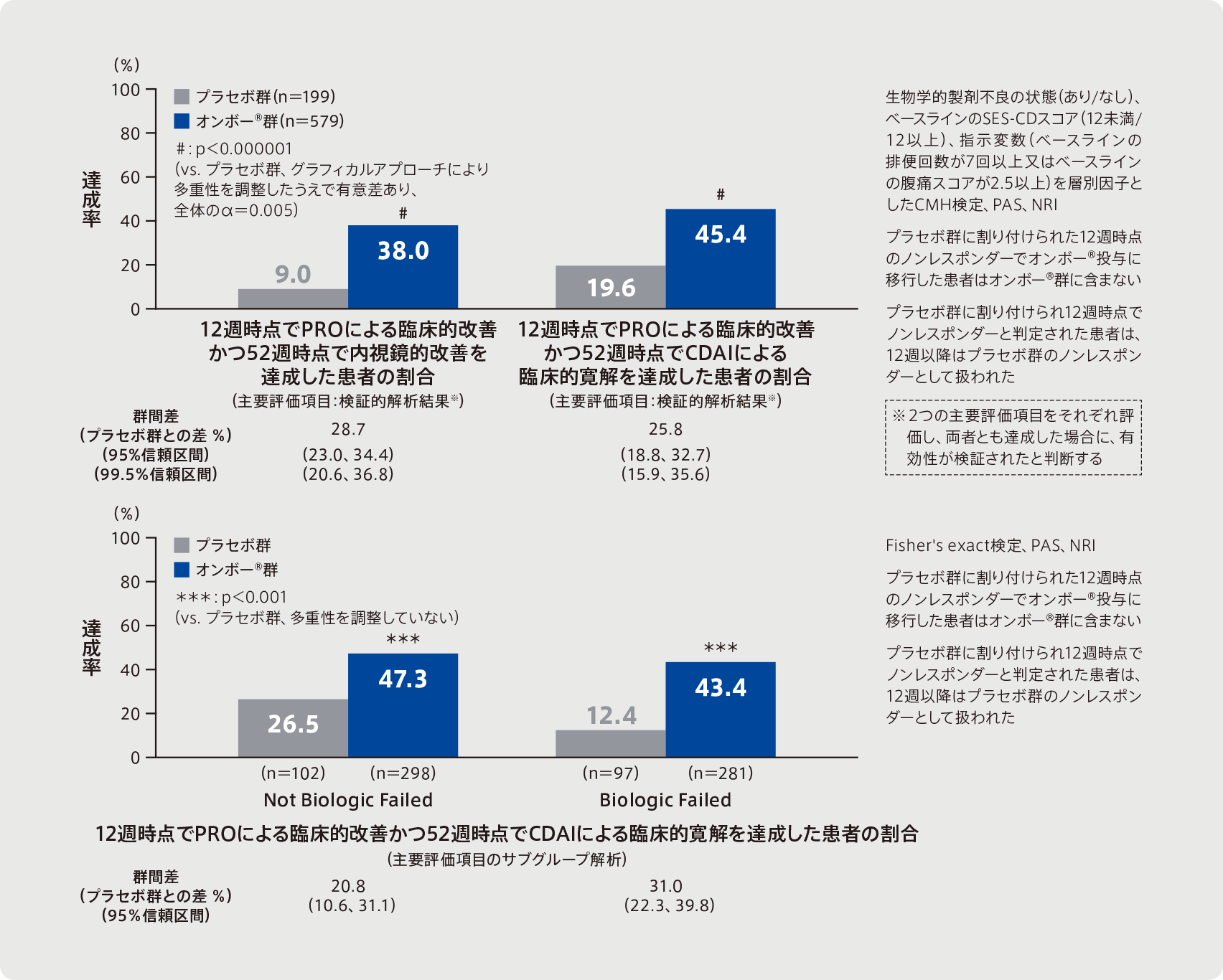 主要評価項目である12週時点でPROによる臨床的改善かつ52週時点で内視鏡的改善を達成した患者の割合及び12週時点でPROによる臨床的改善かつ52週時点でCDAIによる臨床的寛解を達成した患者の割合は、オンボー®群では38.0%(220/579例)及び45.4%(263/579例)であり、プラセボ群の9.0%(18/199例)及び19.6%(39/199例)と比較して、いずれの主要評価項目についても統計学的有意に高いことが示され(それぞれp<0.000001、CMH検定、多重性調整を実施)、プラセボ群に対するオンボー®群の優越性が検証された。