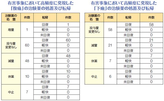 転帰は、増量では回復1/1件、投与量変更なしでは回復60/60件、減量では回復48/48件、休薬では回復10/10件、中止では回復7/7件であり、いずれの事象も回復しました。