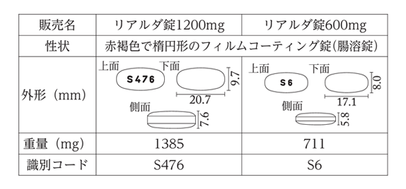 リアルダ錠600mgの大きさは、長径17.1mm×短径8.0mm×厚さ5.8mm、リアルダ錠1200mgの大きさは、長径20.7mm×短径9.7mm×厚さ7.6mmです。電子添文抜粋