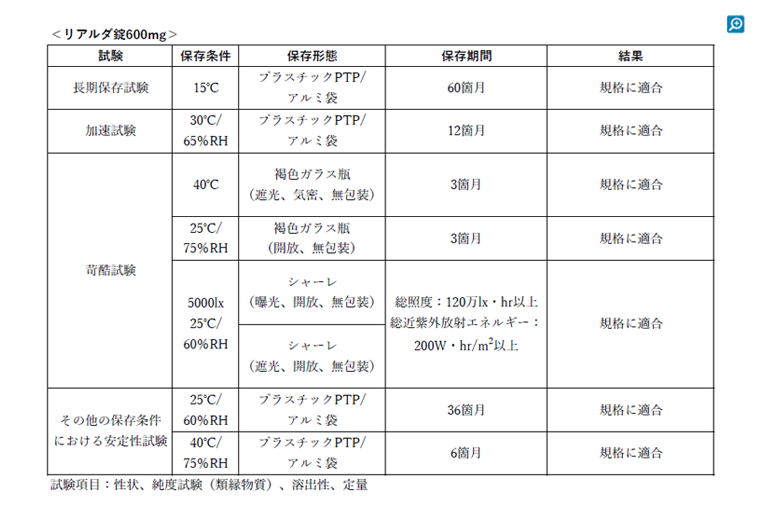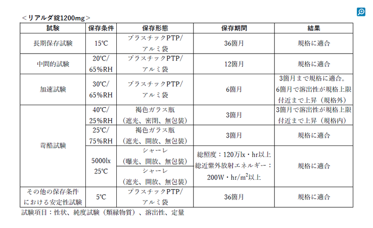 リアルダ錠1200mgについて、室温保存の規定(1~30℃)の上限である30℃(65%RH)で6ヵ月の加速試験を実施したところ、3ヵ月まで規格に適合しましたが、6ヵ月で溶出性が規格上限付近まで上昇し規格外となったためです1)。