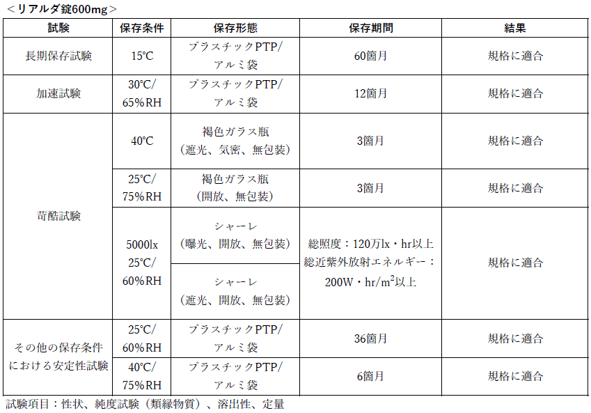 リアルダ錠の各種条件下における安定性は?